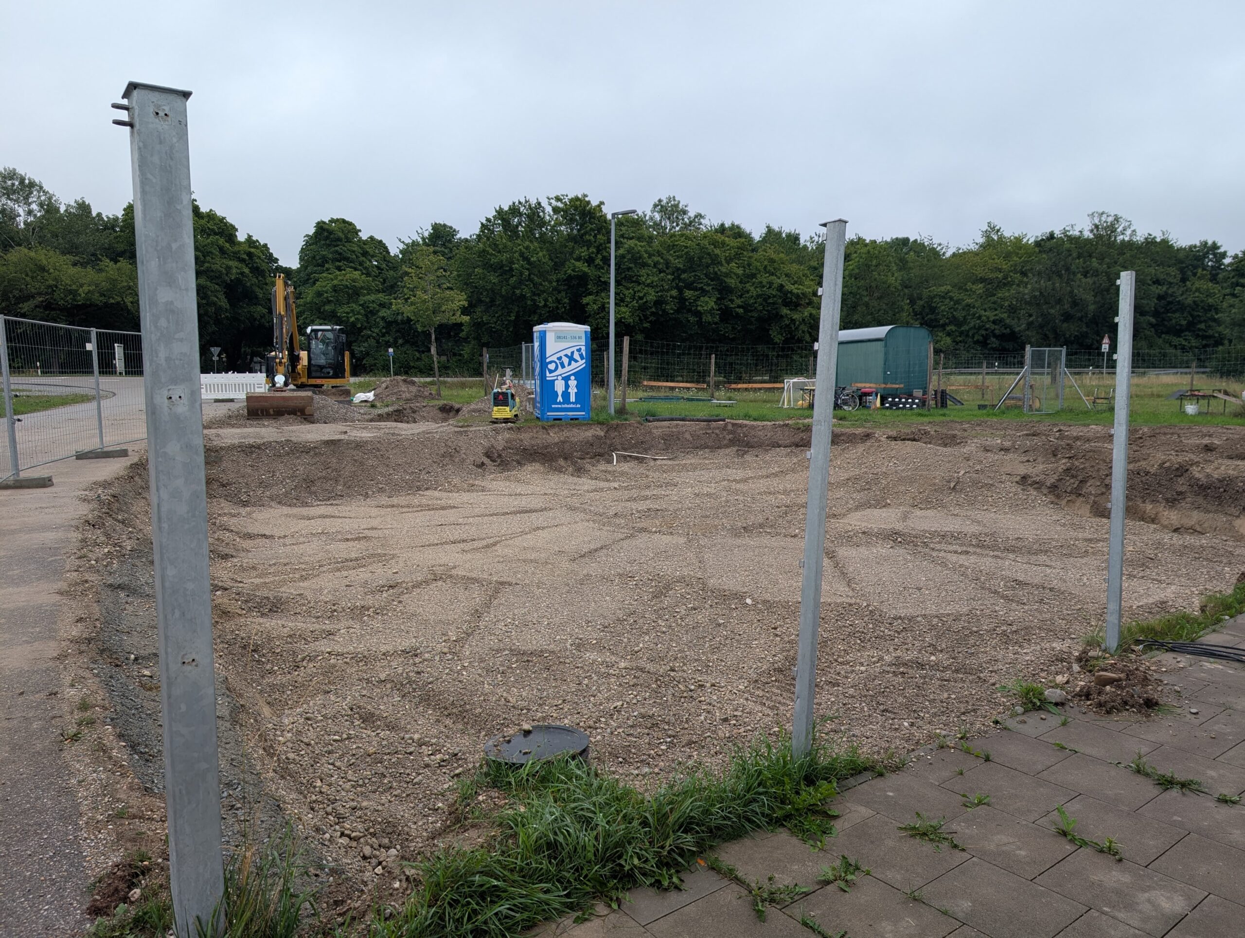 Juli 2025: Der Aushub hat stattgefunden. So groß ist die Fläche, auf der Personalküche, Empfang, Büro, Personalraum WC, Krankenzimmer, Quarantänezimmer, Technik und die Desinfektion untergebracht sind.