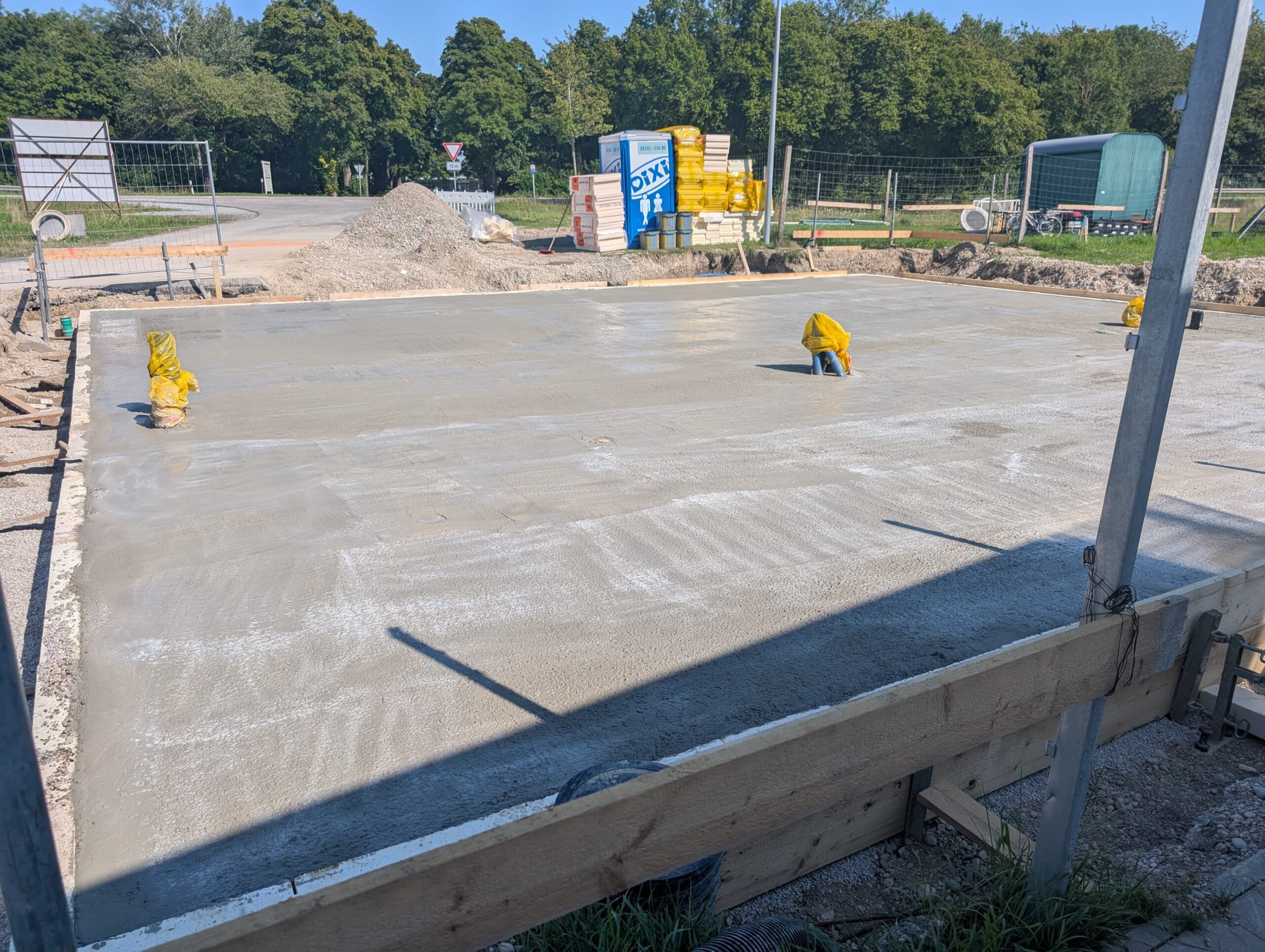 August 2025: Und schon ist alles wieder verschlossen und die Bodenplatte gesetzt. Nach einer kurzen Pause starten wir im September mit den ersten Fertigwandteilen.