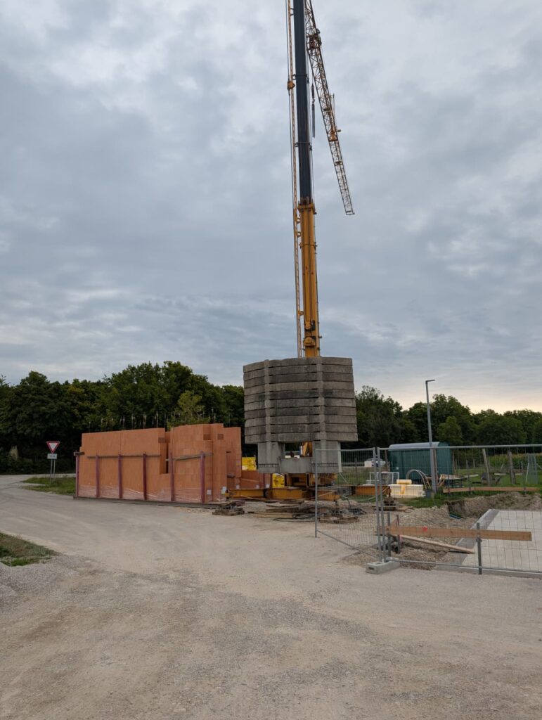 September 2025: Schlag auf Schlag geht es weiter. Der Kran steht, die ersten Teile sind geliefert. Nun können die Wände aufgestellt werden!